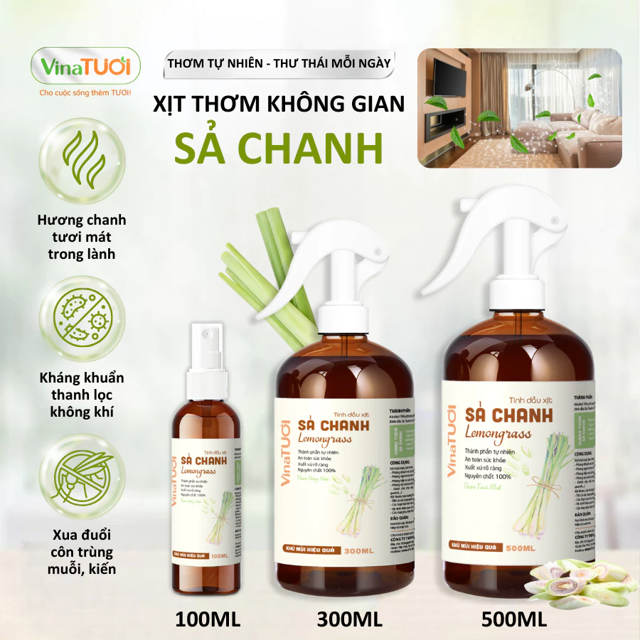 Bình xịt thơm phòng Vina Tươi mùi Sả Chanh là sự kết hợp hoàn hảo giữa liệu pháp hương thơm thư giãn và khả năng bảo vệ không gian sống. Với thành phần 100% tinh dầu thiên nhiên nguyên chất, sản phẩm mang đến hương chanh tươi mát, giúp thanh lọc không khí và xua đuổi các loại côn trùng gây hại như muỗi, kiến một cách an toàn.