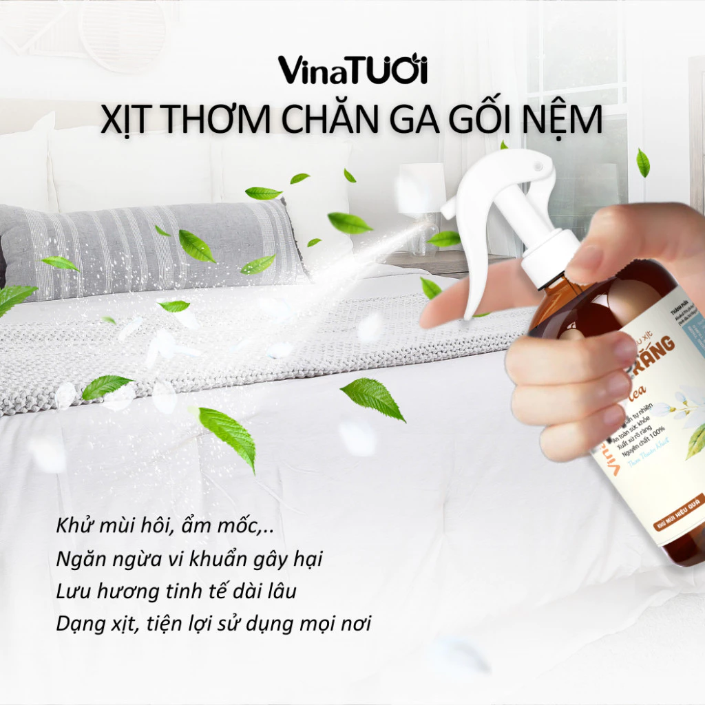 Xịt thơm chăn ga gối nệm Vina Tươi 300ml hương Bạch Đàn Chanh là giải pháp vệ sinh không gian ngủ thông minh, kết hợp sức mạnh khử khuẩn từ tinh dầu thiên nhiên nguyên chất. Với mùi hương thanh khiết đặc trưng, sản phẩm không chỉ đánh bay mùi ẩm mốc mà còn hỗ trợ bảo vệ hệ hô hấp và xua đuổi côn trùng hiệu quả.