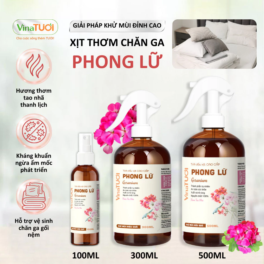 Xịt thơm chăn ga gối nệm Vina Tươi 300ml hương Phong Lữ là sự lựa chọn tinh tế cho những ai yêu thích mùi hương hoa cỏ sang trọng và mong muốn một giải pháp làm sạch an toàn. Với chiết xuất 100% tinh dầu thiên nhiên nguyên chất, sản phẩm không chỉ đánh bay mùi ẩm mốc mà còn bảo vệ gia đình bạn khỏi vi khuẩn, mang lại cảm giác thư thái như đang nghỉ dưỡng tại resort.
