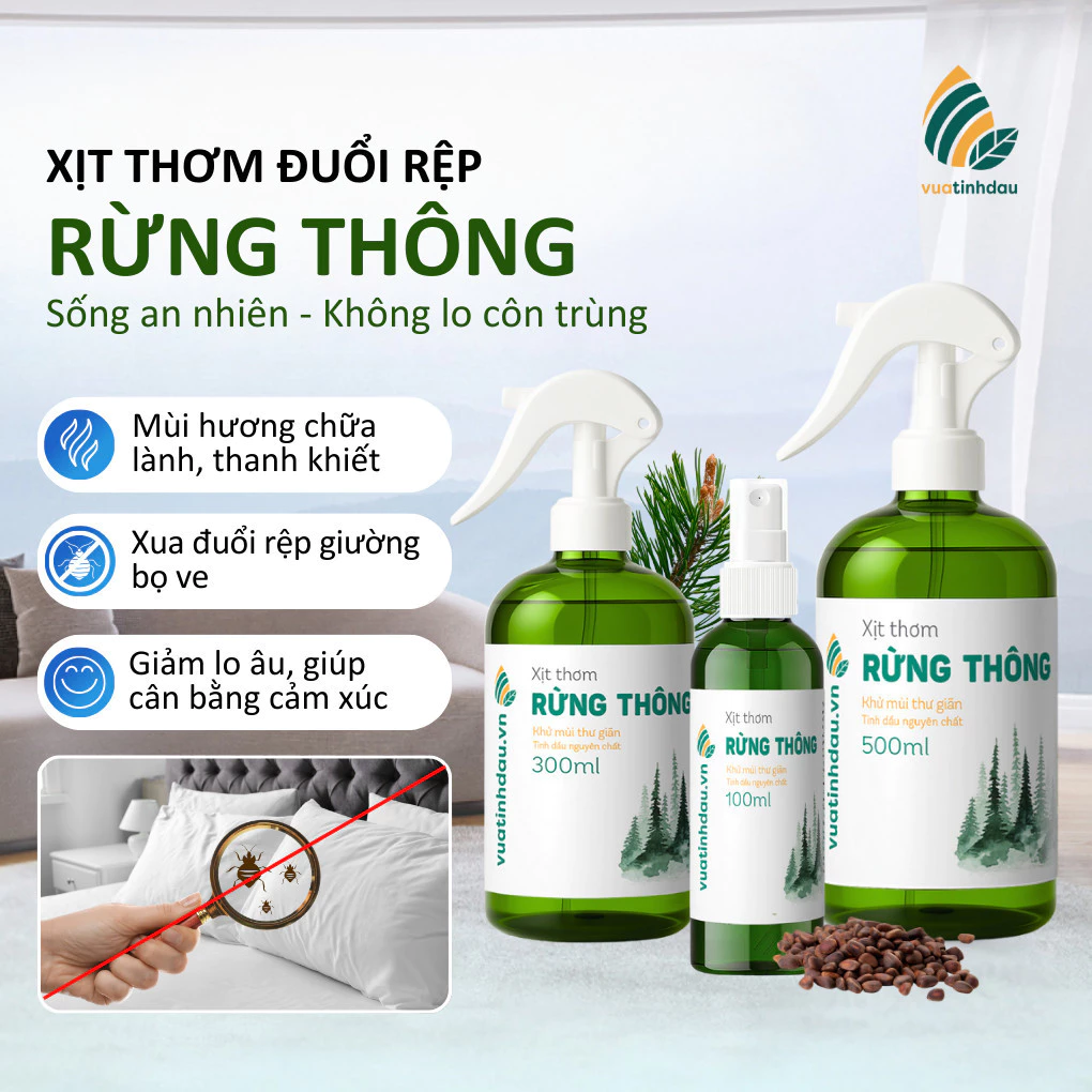 Xịt thảo mộc Rừng Thông VUATINHDAU mang hơi thở của thiên nhiên hoang sơ vào phòng ngủ của bạn. Với sự kết hợp giữa tinh dầu Thông nguyên chất và công thức thảo mộc đặc hiệu, sản phẩm giúp loại bỏ tận gốc rệp giường, mạt bụi và ve chó, đồng thời xử lý triệt để mùi ẩm mốc trên chăn ga gối nệm, mang lại không gian nghỉ ngơi an lành và thư thái.