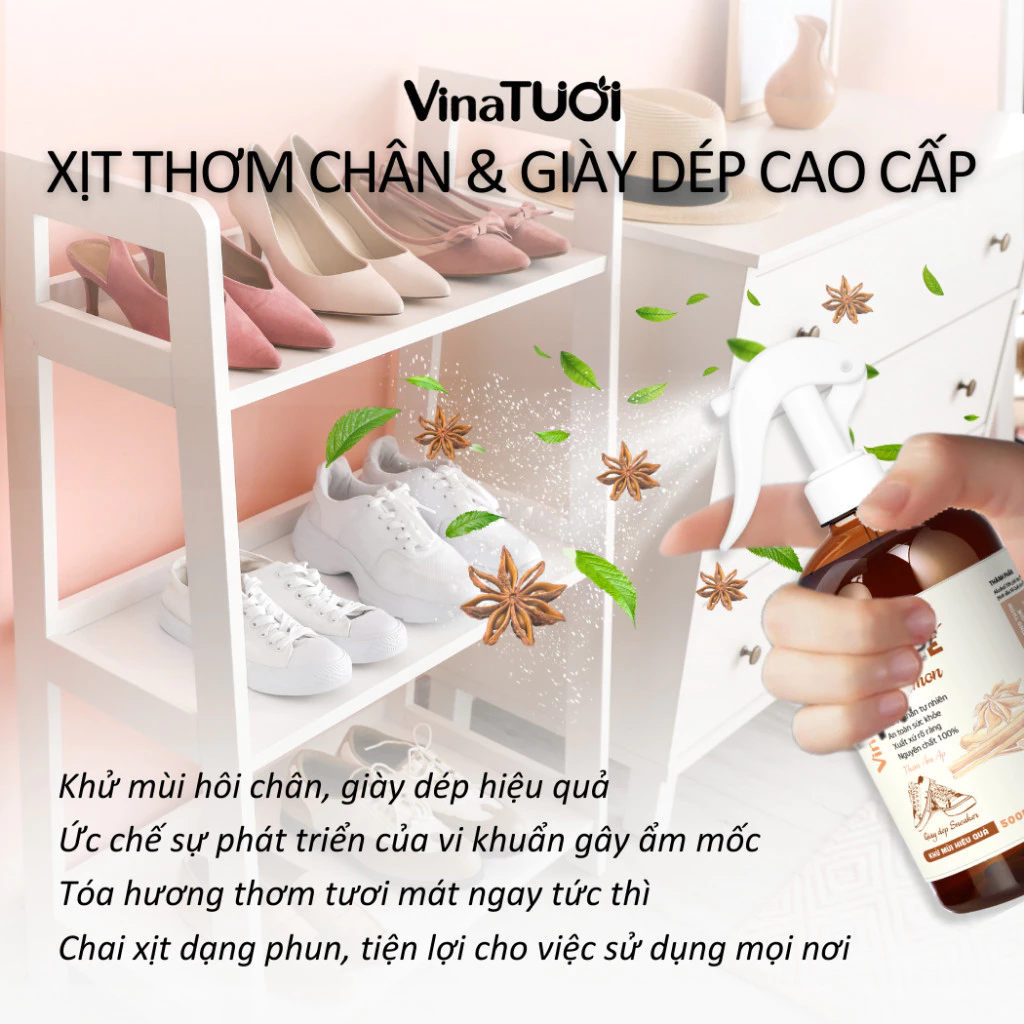 Khử mùi đỉnh cao: Đánh bay mùi hôi chân và giày dép hiệu quả chỉ sau vài lần xịt.