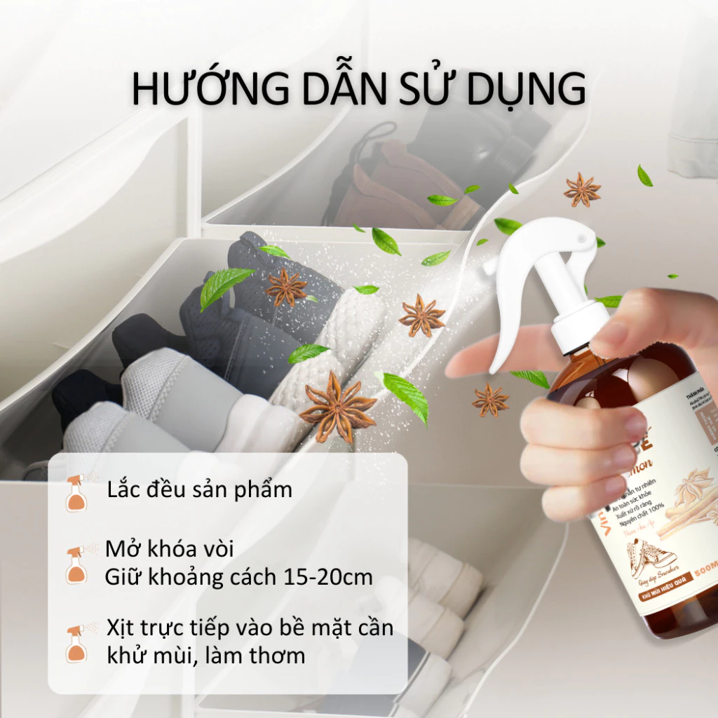 Xịt trực tiếp: Nhấn vòi xịt trực tiếp vào bề mặt cần khử mùi, làm thơm (lòng giày, tất, bàn chân).