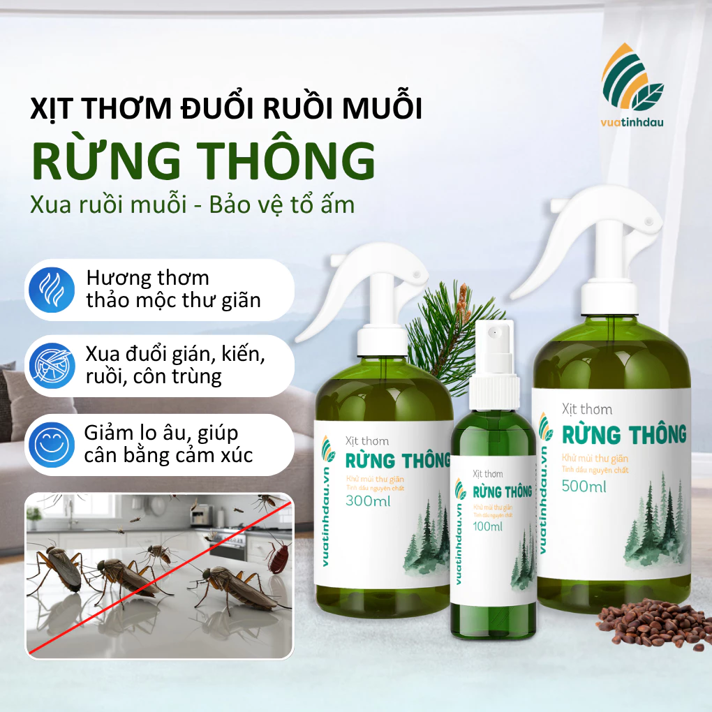 Xịt tinh dầu Rừng Thông VUATINHDAU là giải pháp đưa thiên nhiên hoang sơ vào ngôi nhà của bạn. Với chiết xuất từ tinh dầu thông nguyên chất, sản phẩm không chỉ giúp xua đuổi muỗi, kiến, gián mà còn là “bậc thầy” trong việc khử mùi ẩm mốc, mang lại không gian sống sạch sẽ, thơm mát và cực kỳ an toàn cho trẻ nhỏ.