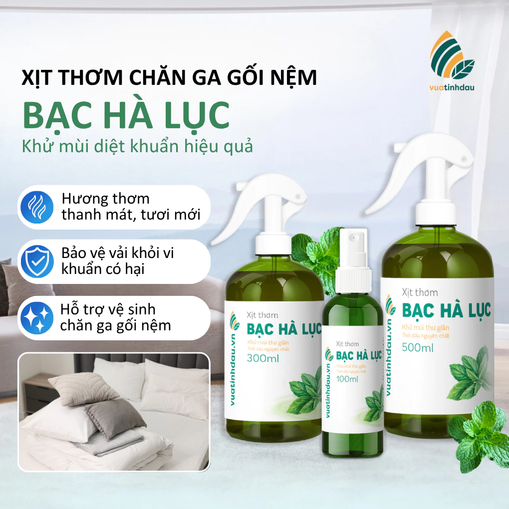 Đánh thức mọi giác quan và mang lại sự trong lành cho không gian nghỉ ngơi với Xịt thơm chăn ga gối nệm Vua Tinh Dầu 300ml hương Bạc Hà Lục. Với sức mạnh từ tinh dầu thiên nhiên nguyên chất, sản phẩm không chỉ loại bỏ mùi hôi, ẩm mốc mà còn mang đến cảm giác mát lạnh, sảng khoái, giúp bạn thư giãn tuyệt đối sau một ngày dài.