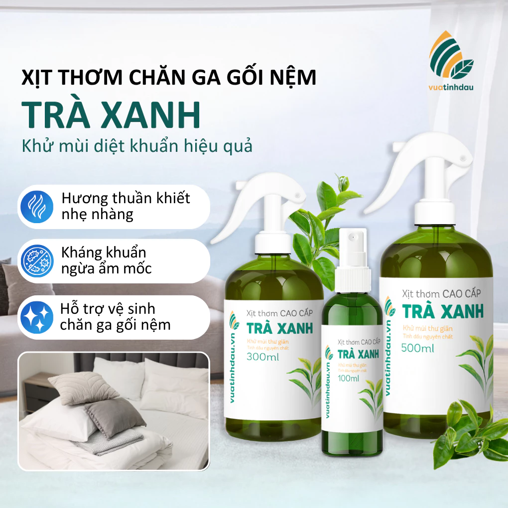 Giữ cho phòng ngủ luôn thuần khiết và sạch sẽ với Xịt thơm chăn ga gối nệm Vua Tinh Dầu 500ml hương Trà Xanh (Green Tea). Sự kết hợp giữa sức mạnh kháng khuẩn tự nhiên và hương thơm dịu nhẹ của lá trà tươi giúp loại bỏ hoàn toàn mùi hôi, bảo vệ sức khỏe hệ hô hấp và mang lại giấc ngủ thư thái nhất.