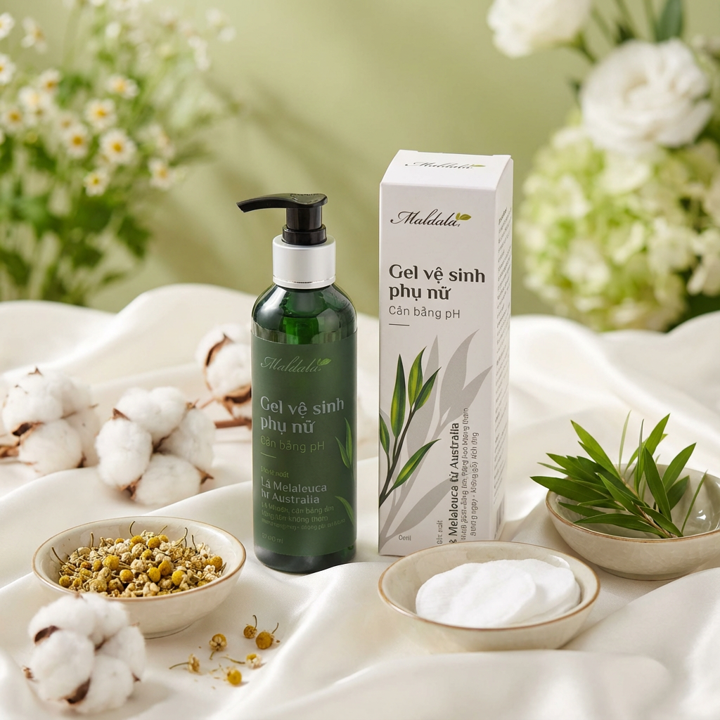 Kháng khuẩn & Làm sạch sâu: Tinh dầu Melaleuca (Tràm trà Úc) nổi tiếng với khả năng kháng khuẩn tự nhiên, giúp làm sạch vùng nhạy cảm một cách an toàn mà không gây khô rát.