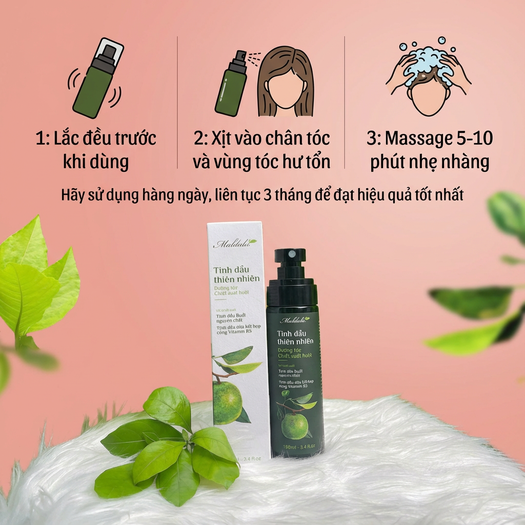 Đánh thức vẻ đẹp óng ả của mái tóc với Tinh dầu dưỡng tóc thiên nhiên Maldala. Đây là sự kết hợp tinh tế giữa các “thần dược” dưỡng tóc truyền thống và khoa học hiện đại: Tinh dầu Bưởi nguyên chất, Tinh dầu Dừa và Vitamin B5. Sản phẩm là giải pháp hoàn hảo để giải quyết tình trạng tóc khô xơ, gãy rụng, mang lại cho bạn mái tóc suôn mềm, chắc khỏe và đầy sức sống.