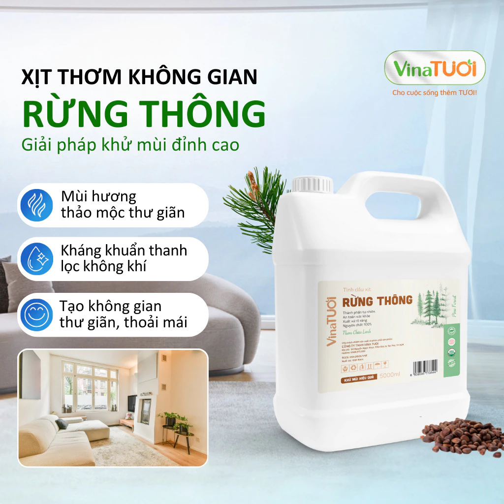 Tinh Dầu Xịt Phòng VINA TƯƠI Can 5L Khử Mùi Thiên Nhiên An Toàn Siêu Tiết Kiệm Mùi Rừng Thông
