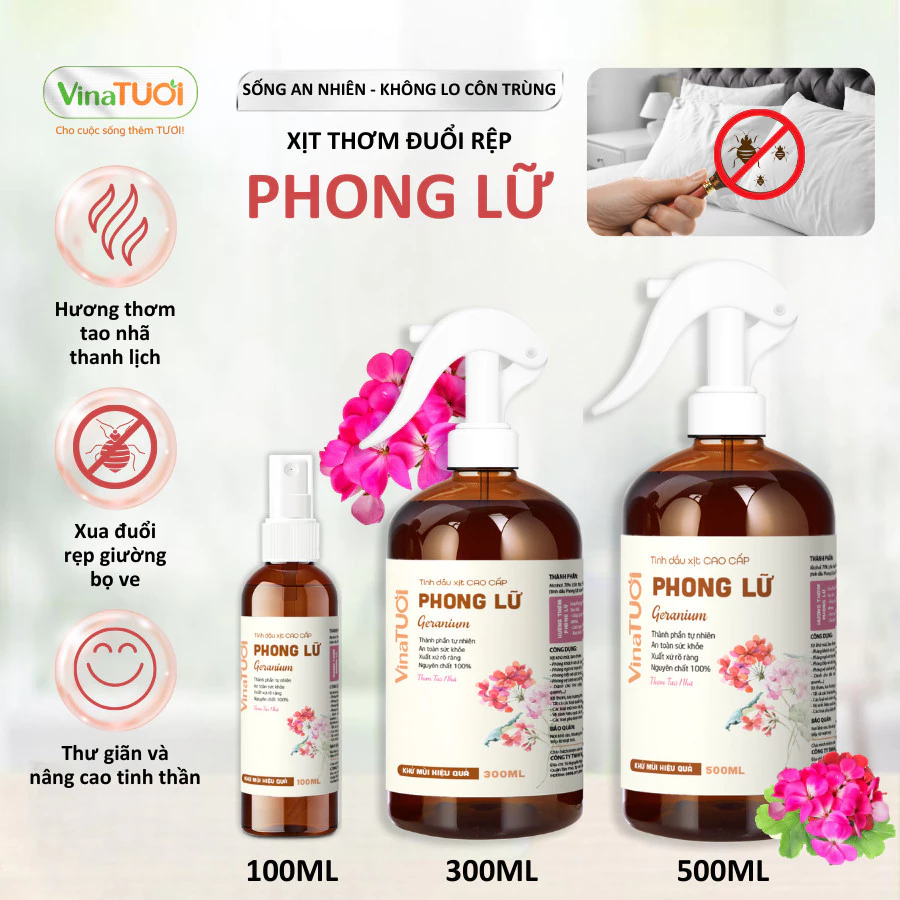 Xịt đuổi rệp Vina Tươi 300ml chiết xuất tinh dầu Phong Lữ giúp tiêu diệt rệp giường, mạt bụi và ve bọ hiệu quả. Sản phẩm 100% tự nhiên, an toàn cho trẻ nhỏ và bà bầu, đồng thời khử mùi ẩm mốc và mang lại hương thơm thư giãn cho không gian sống.