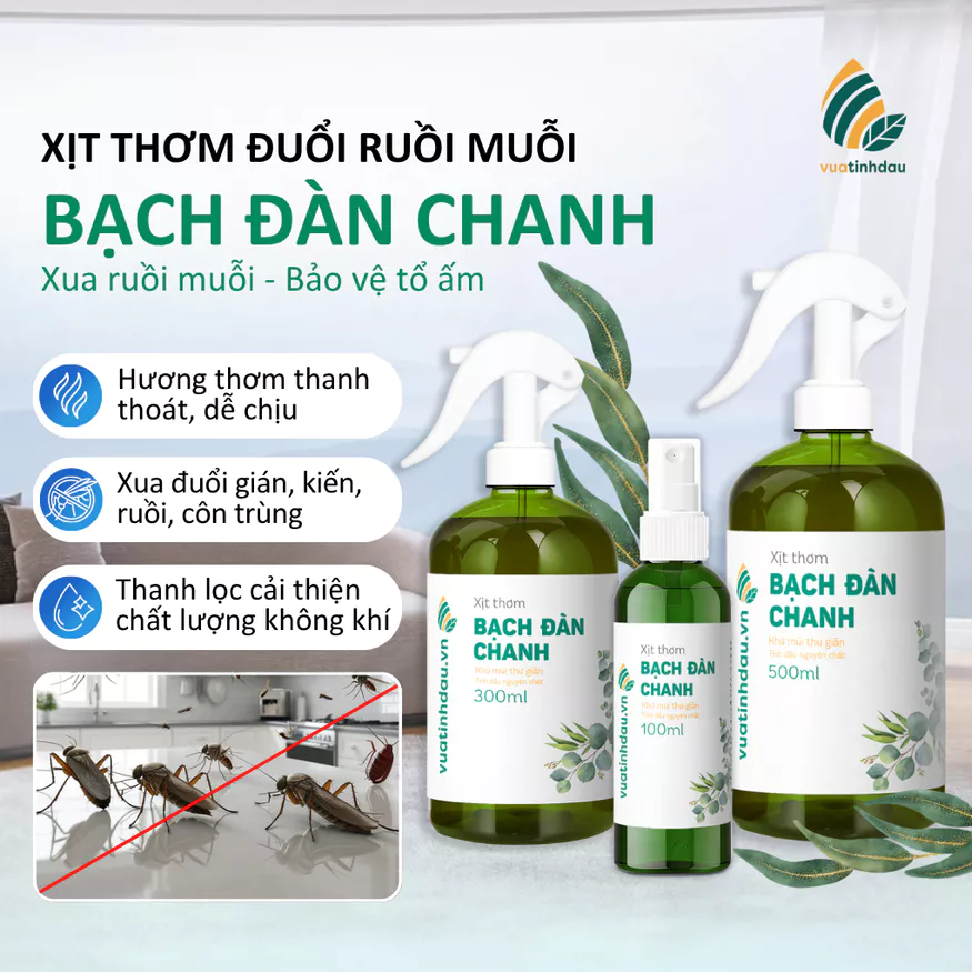 Xịt tinh dầu Bạch Đàn Chanh VUATINHDAU mang đến giải pháp bảo vệ sức khỏe gia đình dựa trên liệu pháp thảo dược tự nhiên. Với hương thơm thanh khiết, mát lành, sản phẩm không chỉ giúp xua đuổi muỗi, kiến, gián mà còn có khả năng kháng khuẩn, thanh lọc bầu không khí, giúp bé yêu ngủ ngon và chơi đùa an toàn.