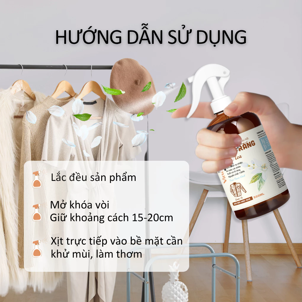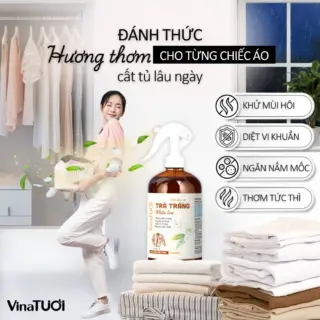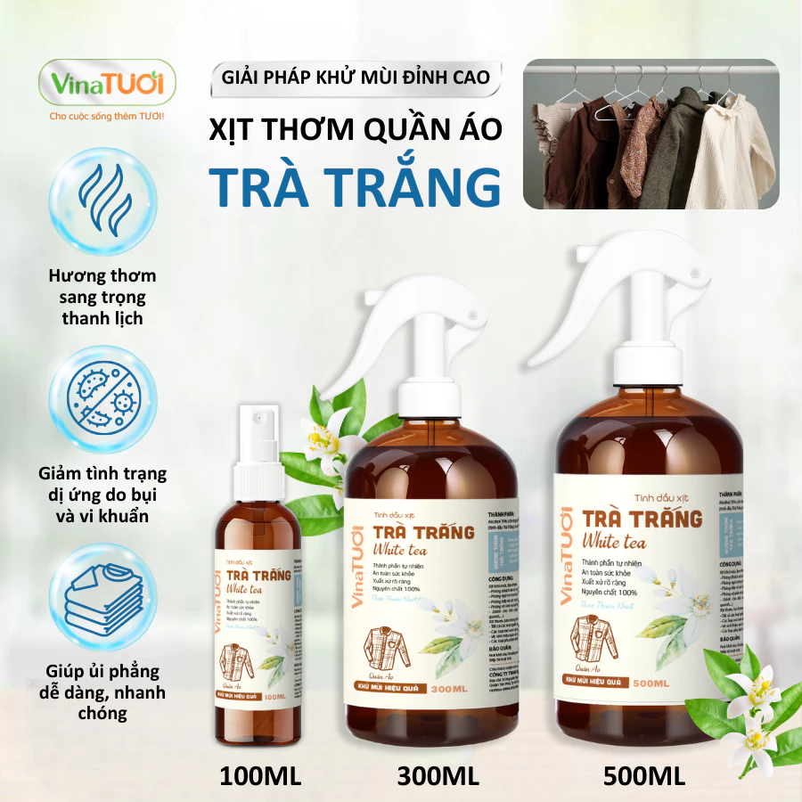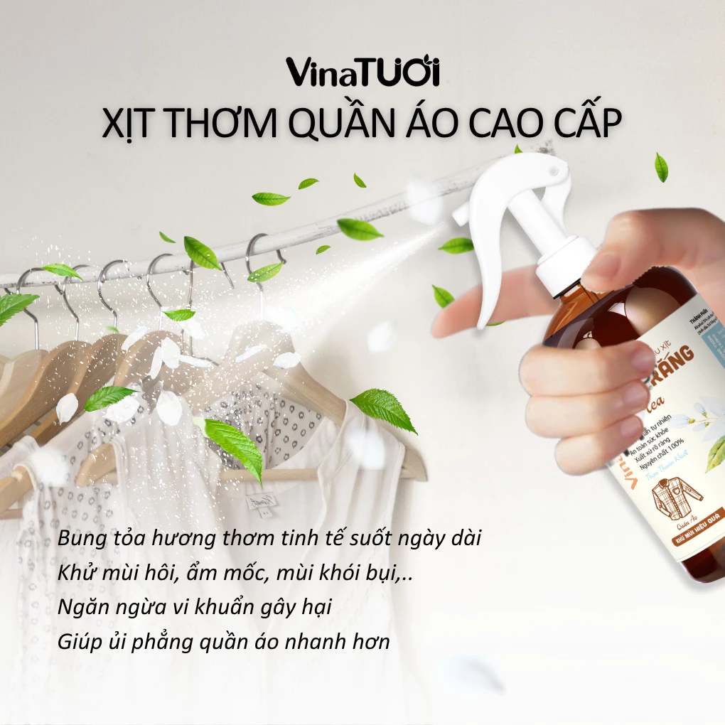 Xịt thơm quần áo Trà Trắng Vina Tươi 300ml khử mùi hôi, ẩm mốc cấp tốc và lưu hương thanh lịch. Chiết xuất tinh dầu thiên nhiên 100% an toàn cho mẹ bầu và bé, giúp bạn tự tin vận động cả ngày dài.
